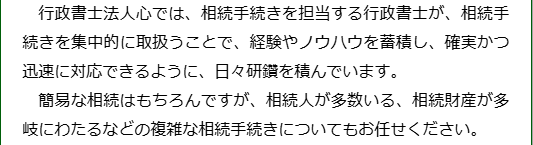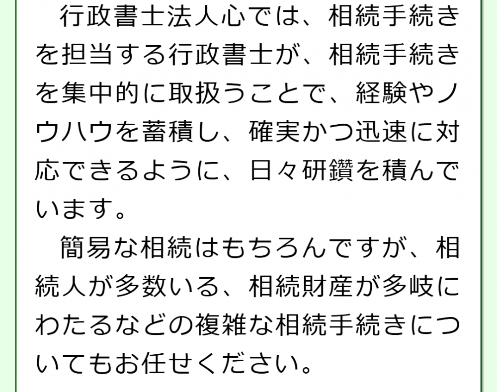 相続手続きを集中的に扱っている行政書士が、必要な書類のリストアップや一部書類の収集、各機関への問合せ等対応させていただきますので、安心してお任せいただければと思います。