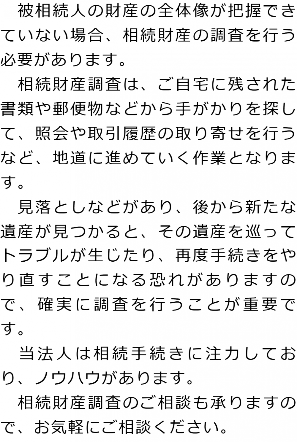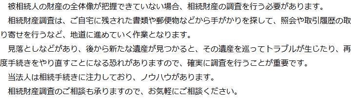 トップ業務内容相続財産調査 階層構造▼ 業務内容(目次) 相続財産調査 業務内容(目次)業務内容トップ行政書士法人心の業務内容遺言遺産整理相続人調査相続財産調査遺産分割協議書の作成預金・貯金の解約・名義変更証券口座の解約・名義変更自動車の名義変更心グループのその他の業務内容家族信託・民事信託節税対策事業承継遺言の検認相続放棄限定承認遺産分割遺留分侵害額請求相続登記相続税申告相続税調査 受付時間 平日 9時~21時、土日祝 9時~18時 夜間・土日祝の相談も対応します (要予約) 所在地 〒144-0051 東京都大田区西蒲田7-44-7西蒲田T・Oビル5F 0120-2403-39 お問合せ・アクセス・地図
