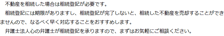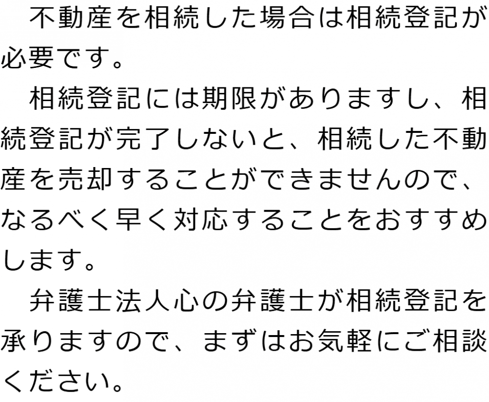 トップ業務内容相続登記 階層構造▼ 業務内容(目次) 相続登記 業務内容(目次)業務内容トップ行政書士法人心の業務内容遺言遺産整理相続人調査相続財産調査遺産分割協議書の作成預金・貯金の解約・名義変更証券口座の解約・名義変更自動車の名義変更心グループのその他の業務内容家族信託・民事信託節税対策事業承継遺言の検認相続放棄限定承認遺産分割遺留分侵害額請求相続登記相続税申告相続税調査 受付時間 平日 9時~21時、土日祝 9時~18時 夜間・土日祝の相談も対応します (要予約) 所在地 〒144-0051 東京都大田区西蒲田7-44-7西蒲田T・Oビル5F 0120-2403-39 お問合せ・アクセス・地図