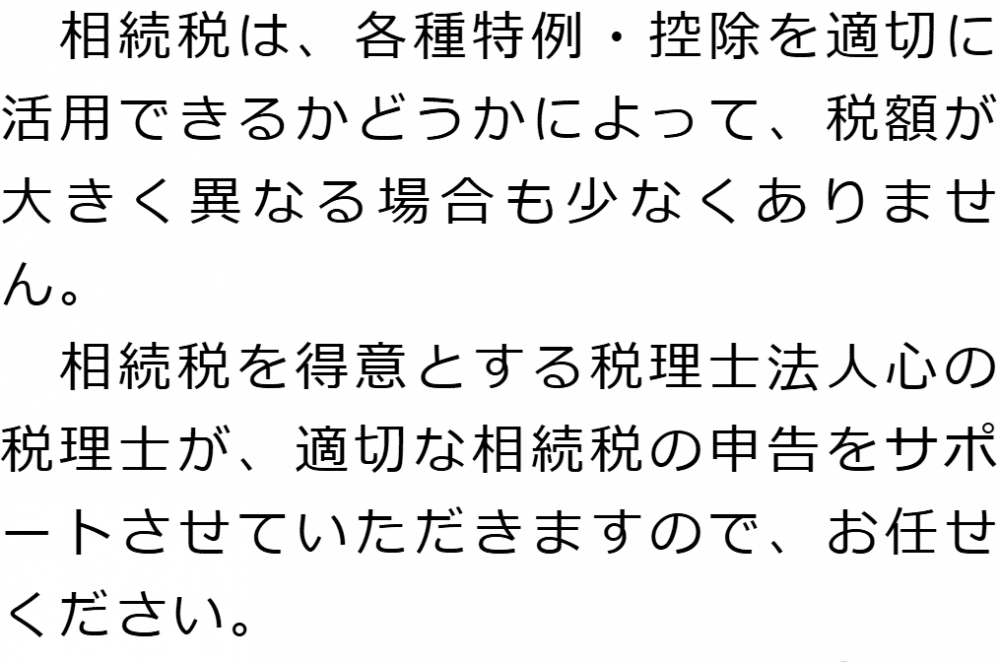 トップ業務内容相続税申告 階層構造▼ 業務内容(目次) 相続税申告 業務内容(目次)業務内容トップ行政書士法人心の業務内容遺言遺産整理相続人調査相続財産調査遺産分割協議書の作成預金・貯金の解約・名義変更証券口座の解約・名義変更自動車の名義変更心グループのその他の業務内容家族信託・民事信託節税対策事業承継遺言の検認相続放棄限定承認遺産分割遺留分侵害額請求相続登記相続税申告相続税調査 受付時間 平日 9時~21時、土日祝 9時~18時 夜間・土日祝の相談も対応します (要予約) 所在地 〒144-0051 東京都大田区西蒲田7-44-7西蒲田T・Oビル5F 0120-2403-39 お問合せ・アクセス・地図